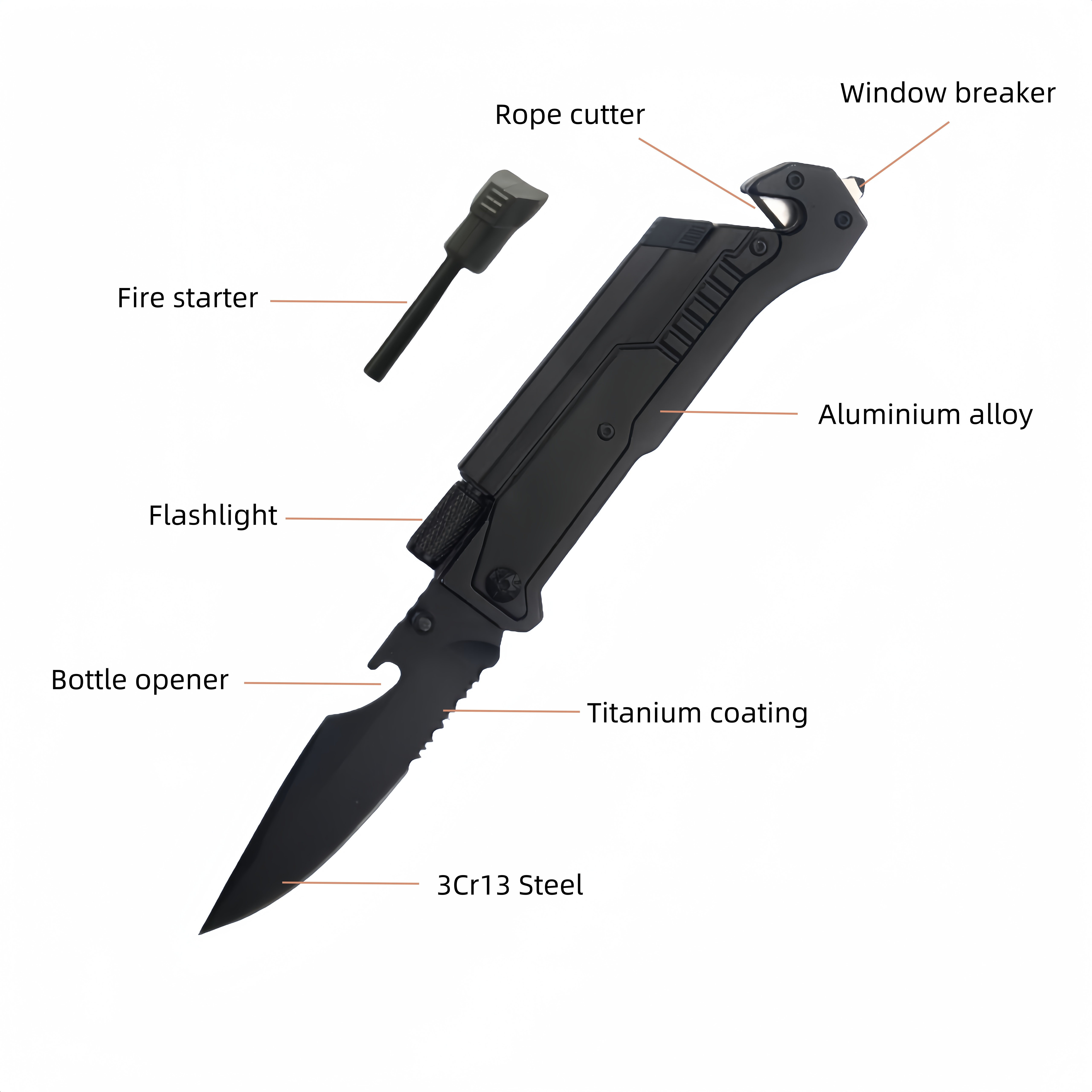 7 in 1 Outdoor camping multifunction folding Aluminum handle with fire starter led light outdoor survival EDC pocket knife