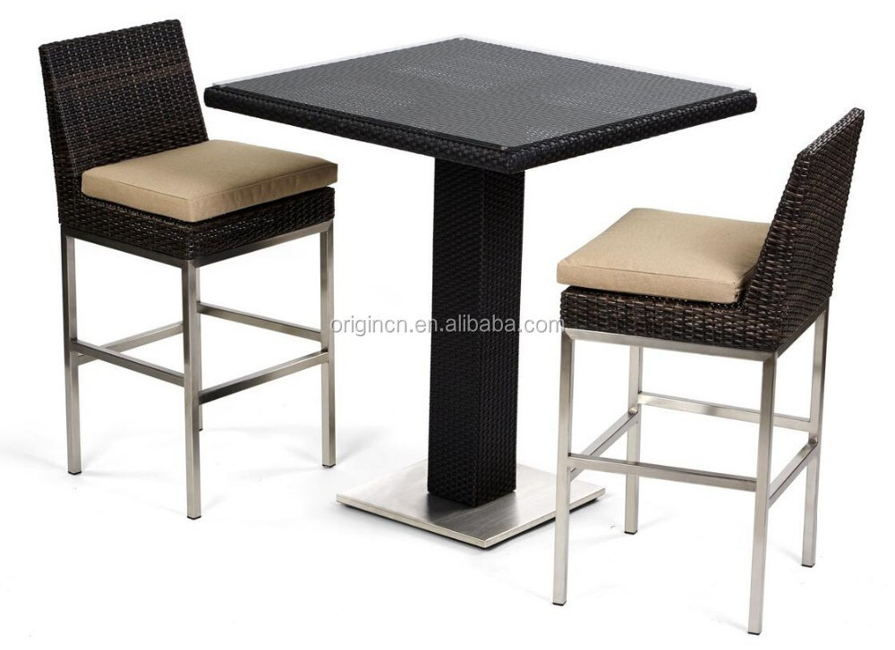 Outdoor leisure modern garden bar furniture set 2 seater chairs and high leg rattan tables cafe