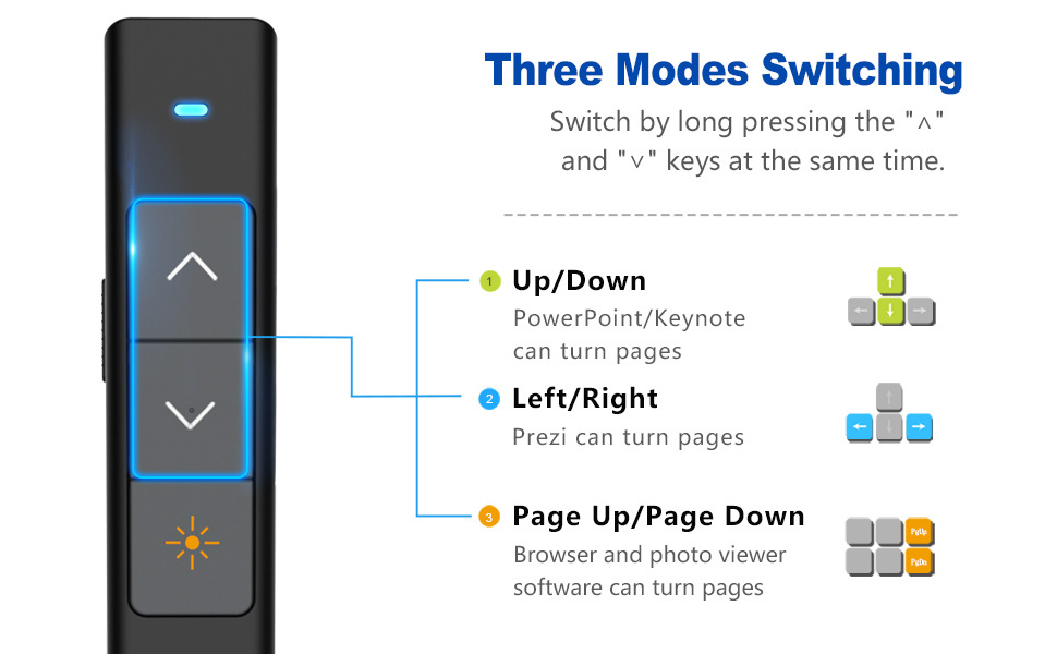Different applications require different hotkeys to turn pages. User can press and hold the "∧" and "∨" keys 1 second at the same time. This allows the presenter to switch to one of 3 modes. By default, the functions of "∧" and "∨" keys are Up and Down. They work for PowerPoint and Keynote. After the first switch, their functions are Right and Left. They work well for Prezi. After the second switch, their functions are the Page up and Page down. They work for web browsers, PDF readers and graphic viewers. After the third switch, their functions turn back to the Right and Left. The presenter will remember your setting for your next use.