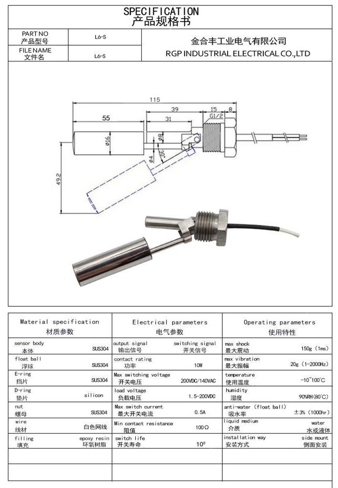 Side mounted stainless steel float switch, L6-S Float Switch