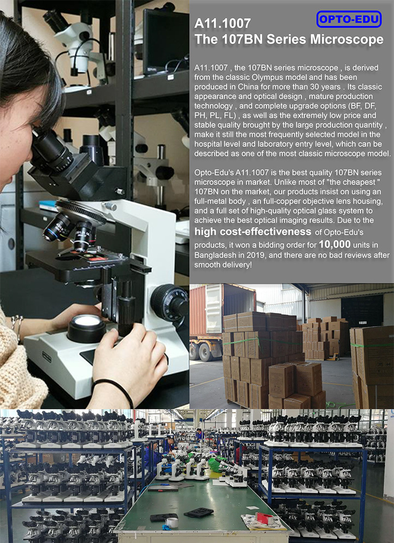 Opto-Edu's A11.1007 is the best quality 107BN series microscope in market. Unlike most of "the cheapest " 107BN on the market, our products insist on using an full-metal body , an full-copper objective lens housing, and a full set of high-quality optical glass system to achieve the best optical imaging results. Due to the high cost-effectiveness of Opto-Edu's products, it won a bidding order for 10,000 units in Bangladesh in 2019, and there are no bad reviews after smooth delivery!