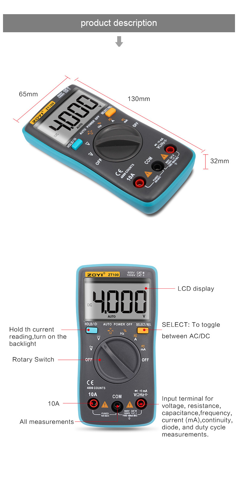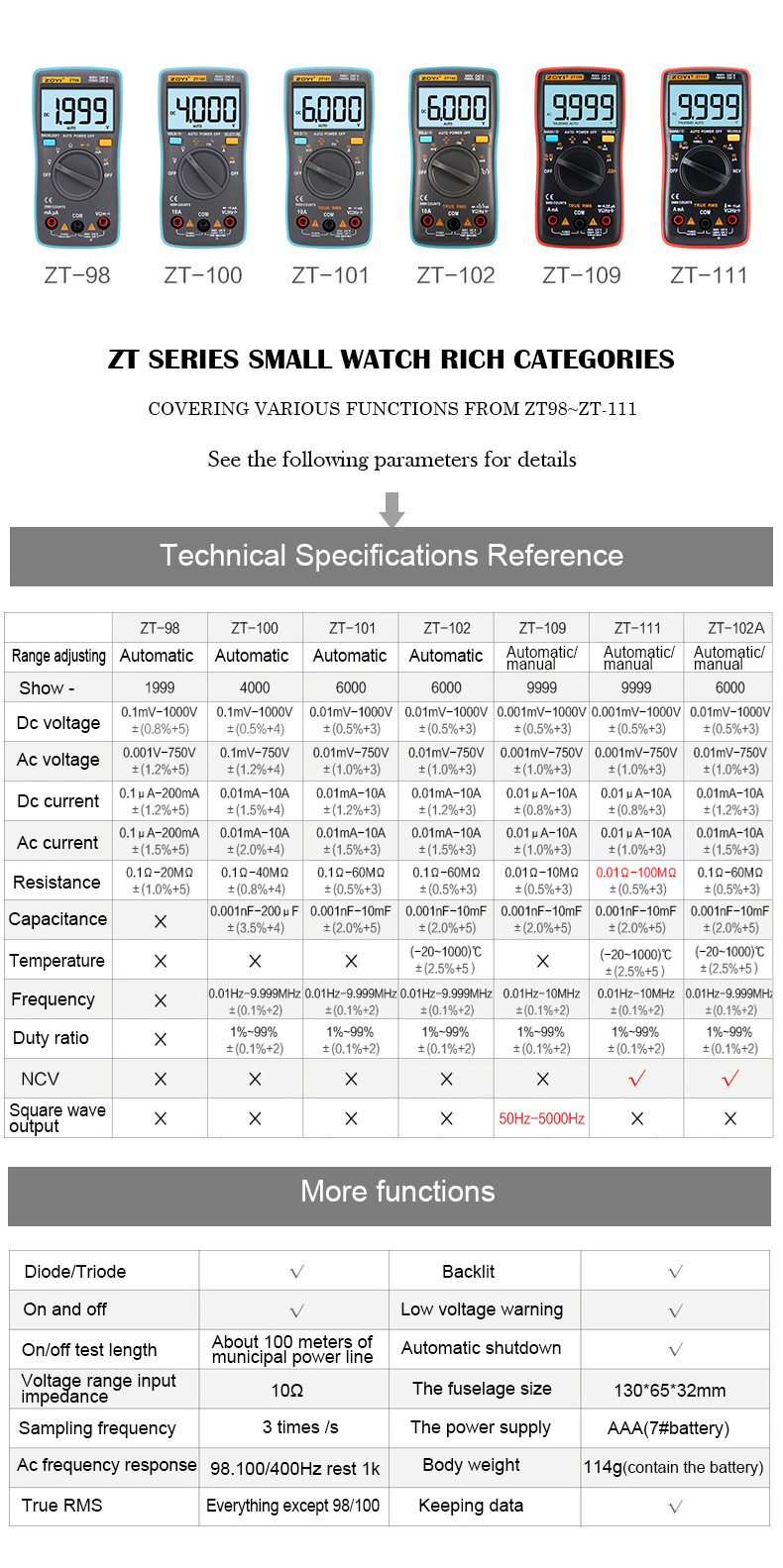 ZT-100 High precision multi function digital multimeter automatic range mini multimeter