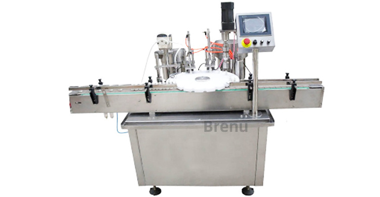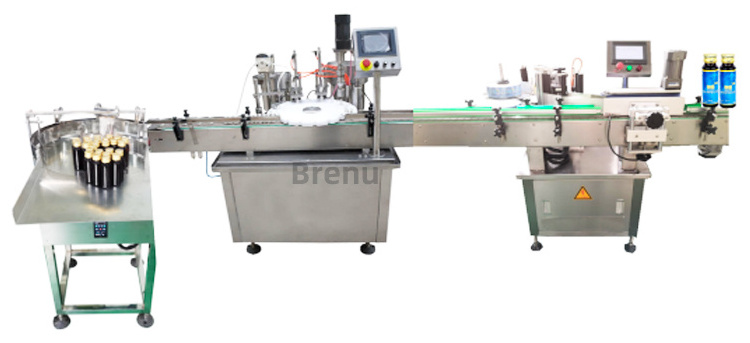 The vial liquid filling capping machine adopts disc positioning, filling, capping, capping, stable operation, peristaltic pump filling, accurate measurement, built-in online cleaning function, and the machine adopts a submersible filling mechanism. The filling head automatically extends into the bottle, this liquid does not overflow, and the touch screen PLC control is convenient for adjustment. The cam divider provides precise workstations to ensure the accuracy of filling, plugging, and capping. This machine can be produced by a single machine, or it can be combined with other equipment to form a linked production line. The vial liquid filling, stopper and capping machine is completely manufactured in accordance with GMP standards, and is widely used in food, health care products and industries.
