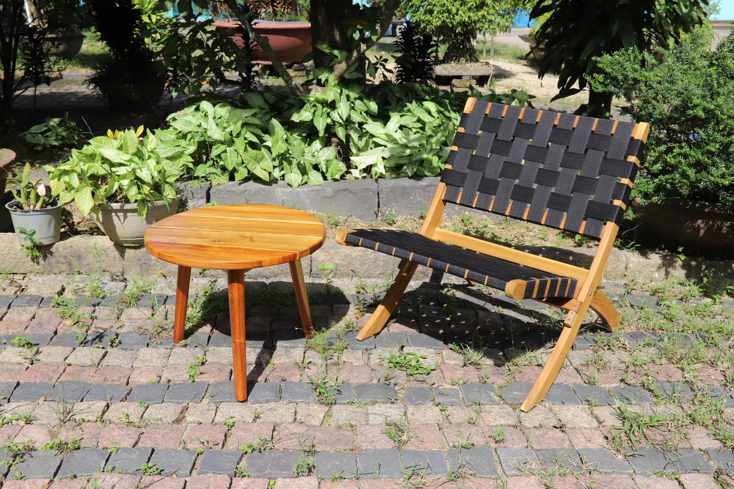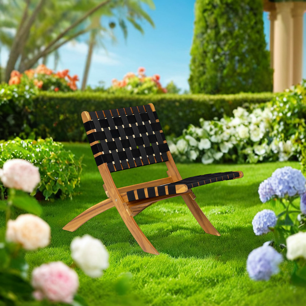 - FEATURES: Sturdy black nylon webbing seat and backrest | Solid acacia wood construction | Beautiful light oiled-wood finish | Chair can be used indoors or out | Low maintenance: just wipe down with soft cloth | No assembly - just unfold | Light weight for transportability.