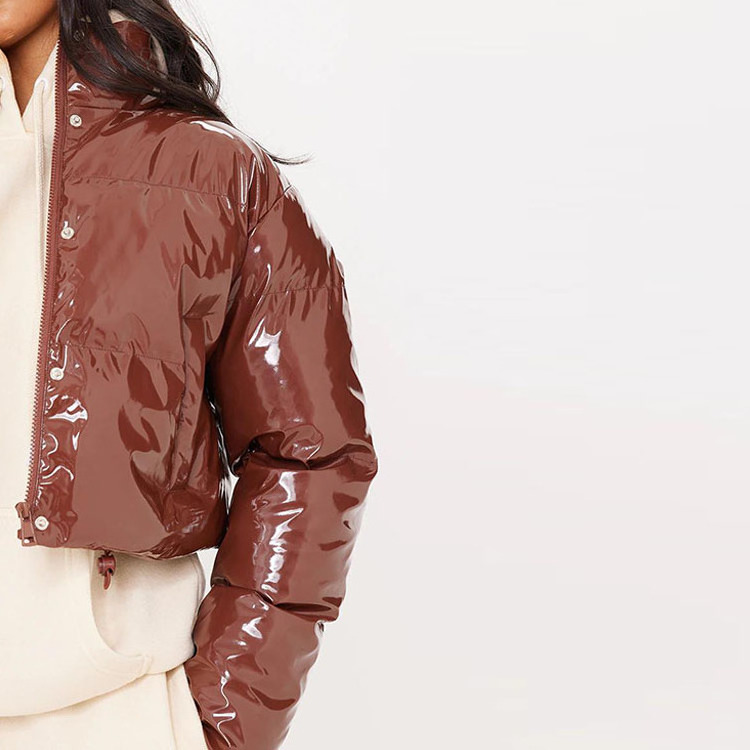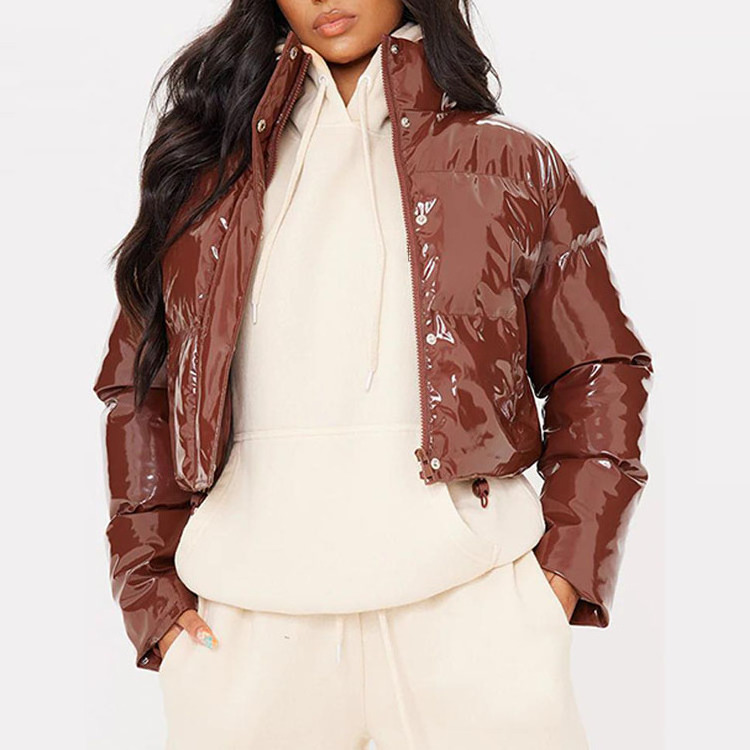 Custom Winter Chocolate color Bright Shinny Duck Down Coat Women Vinyl Cropped Bubble puffer Jacket