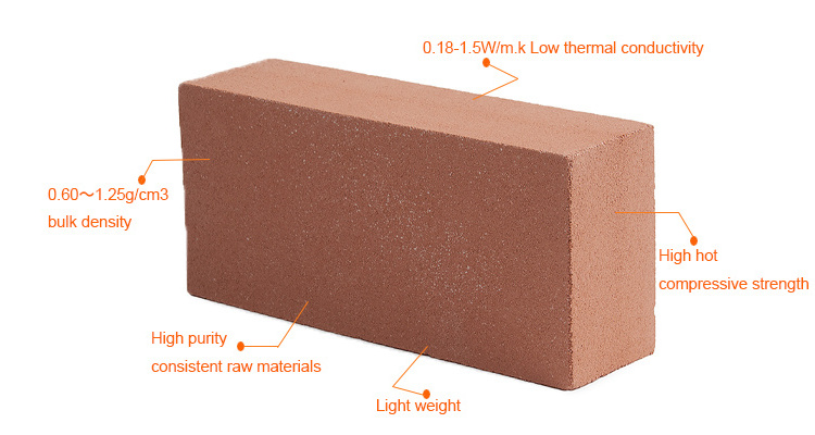 The bulk density of lightweight heat-insulating brick is 0.60~1.25g/cm3. Working temperatures range from 900℃ to 1600℃ Good thermal shock resistance.