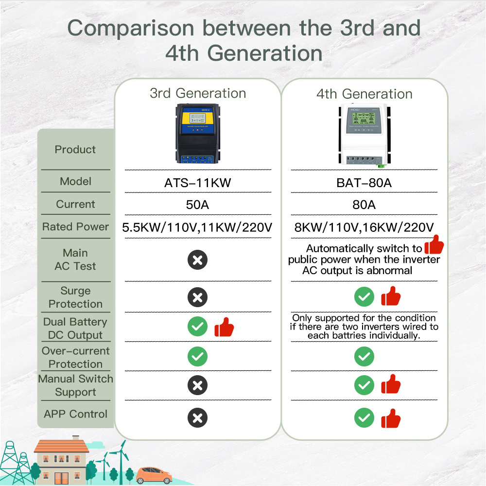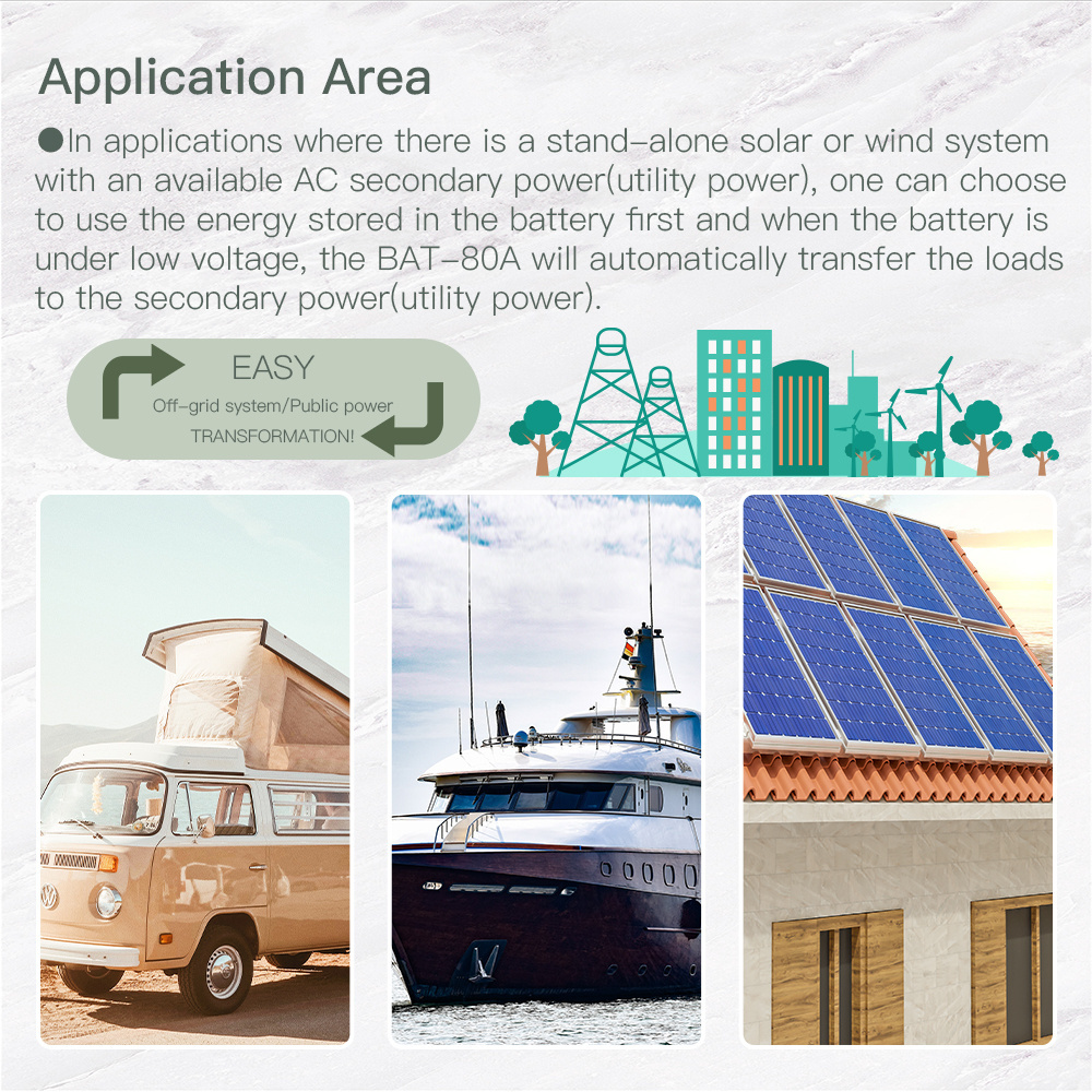 1. In rainy, cloudy, windless days, the off grid solar/wind system can not generate enough electricity. ATS can solve electricty storage limitation problem of off-grid solar system, or when main battery pack of your RV or boat get problem. To keep your electricity 24-hour long.