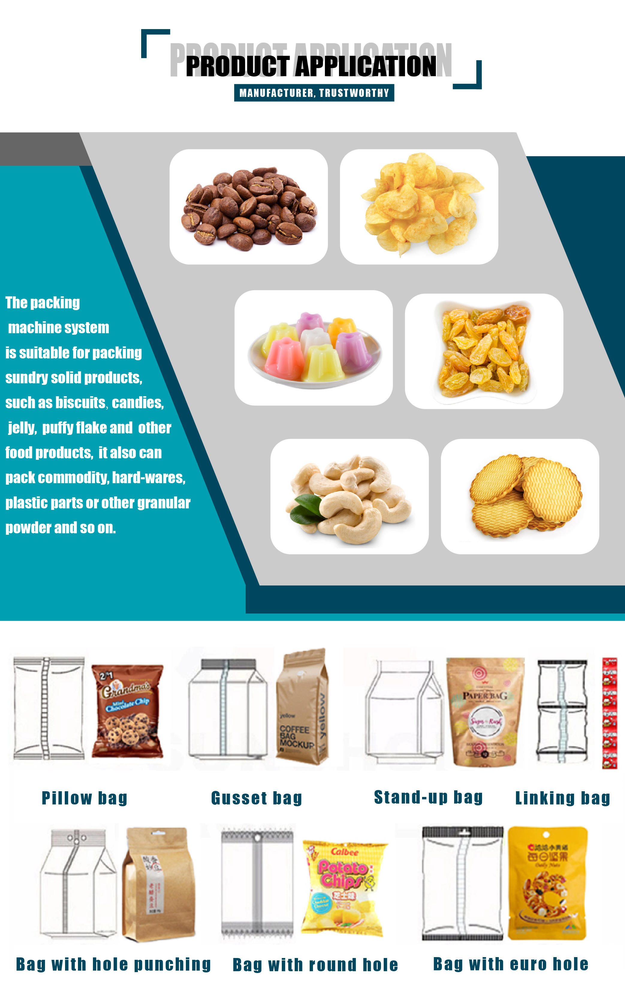 * The way of bag making: the machine can make pillow-type bag and standing-bevel bag, punch bag or according to customer’s requirements.