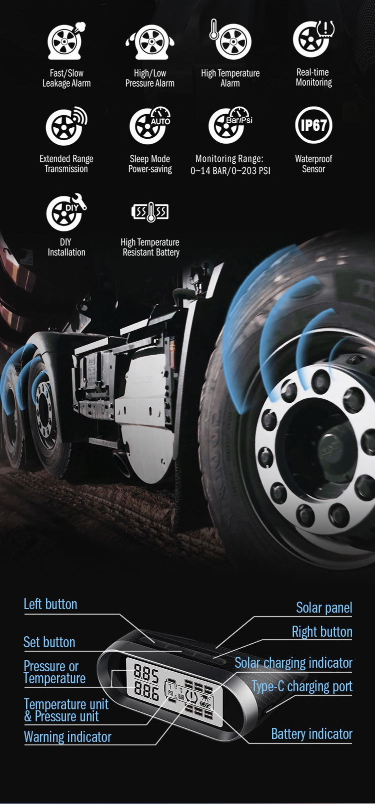 ·3-level brightness display check and display tyre pressure and temperature 2 tyres each time ·Front 2-tyre view/all tyre view mode selectable