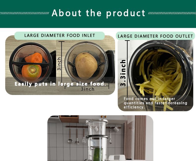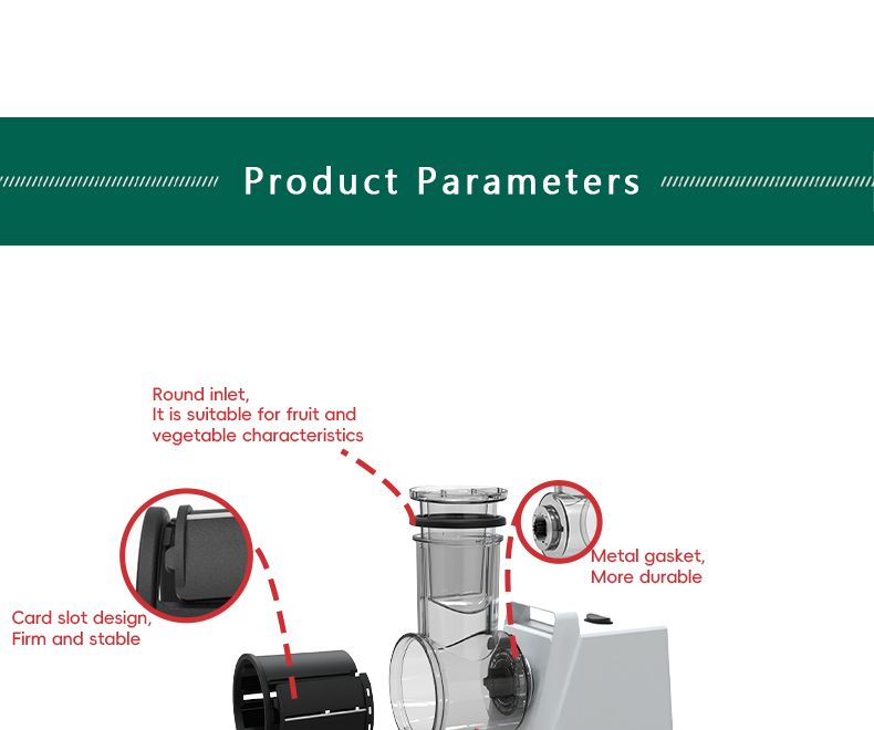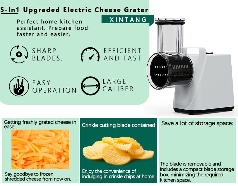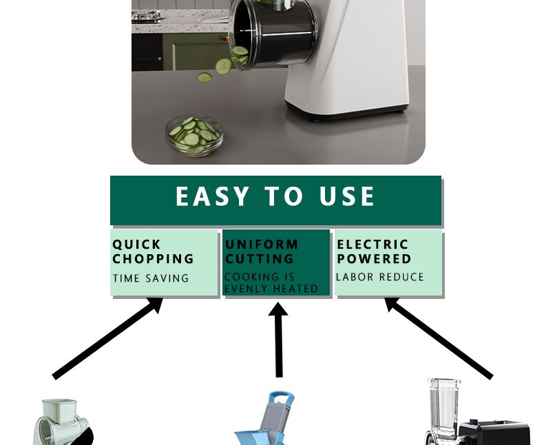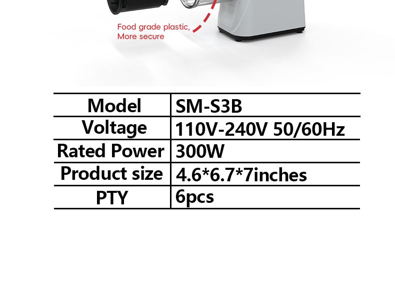 Compact handle design, 300W stable output power, kitchen essential, vegetable slicing, shredding, and grinding.