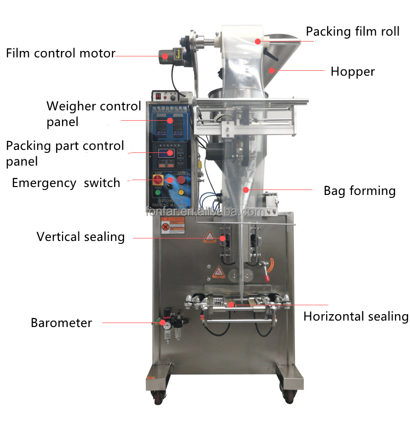 This machine can automatically complete a series of actions, such as bag making, the measuring, filling, infating, counting, sealing, code printing, material giving, stopping in certain quanting, fixed-bag cutting and same cutting. Suitable for package of foodstuff, daily chenical articles, seasoning (For example, expanding, popcorn, melon seed, chicken essence, peanut, ritual, non-sticky power and so on.)