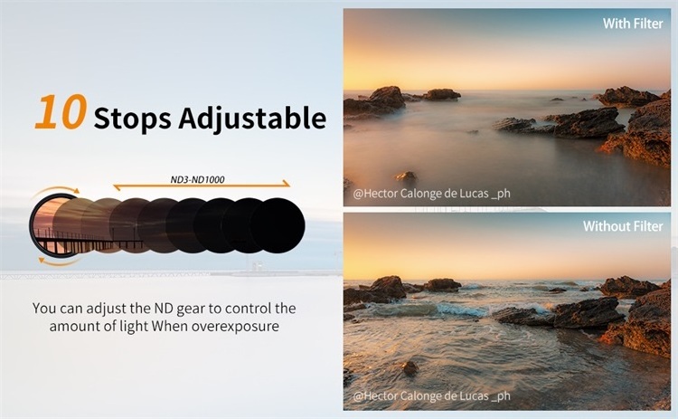 【Premium Material】Made by import AGC Japanese Optical glass, 360 degree rotating between ND3 to ND1000 , more variable stops from 1.5 to 10, reduces the amount of enter light without negative effect colour balance.
