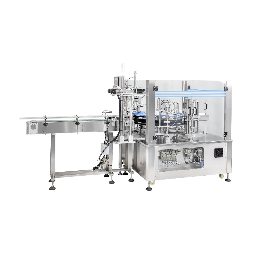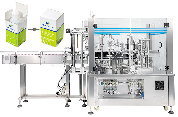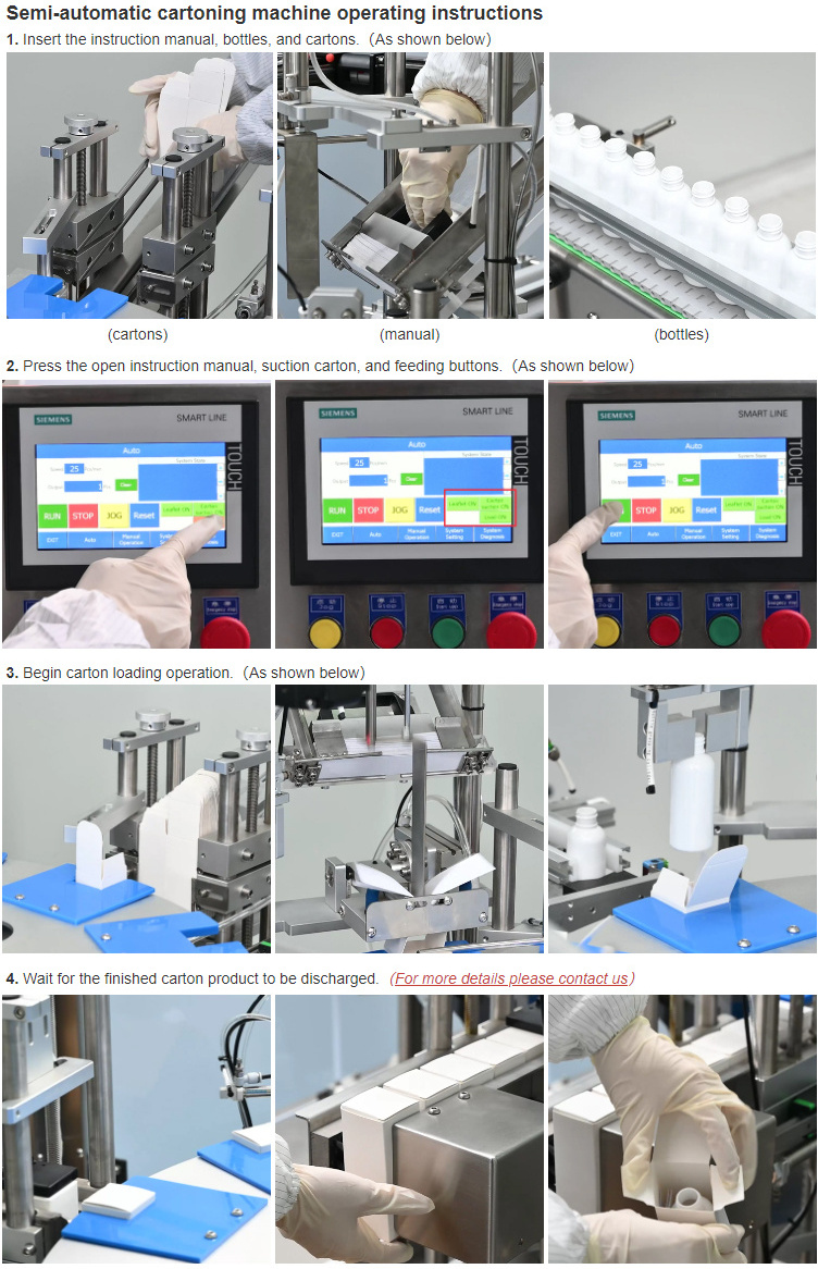 This machine uses vacuum suction cups to feed cartons into the star wheel. The empty cartons are rotated by the star wheel to the folding mechanism 1 to seal the bottom of the carton. After the finished product to be packed is manually placed into the carton, the star wheel rotates the carton to the folding mechanism 2 to seal the top of the carton. Finally, the completed product is transferred by the star wheel to the carton pushing-out mechanism for delivery.