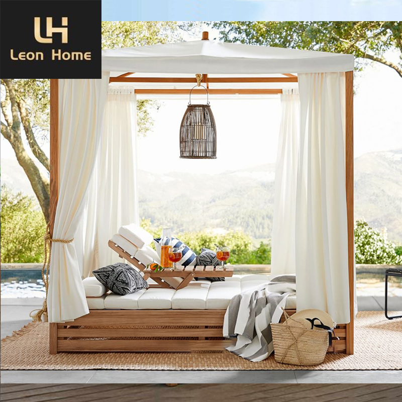 High End Pool Outdoor Garden Sets Solid Wood Teak Daybed Double Chaise Lounge With Canopy Furniture