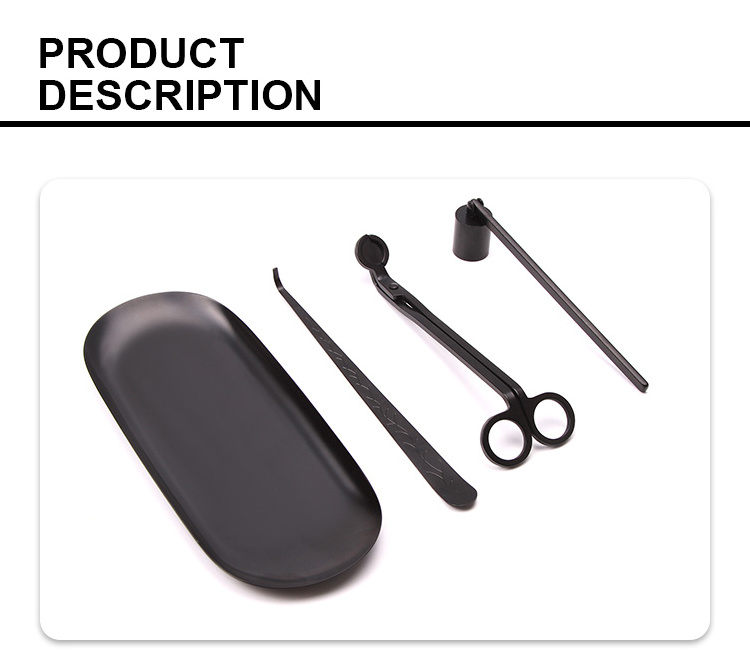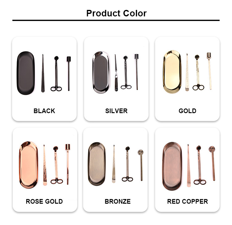 This candle accessories contains: candle wick trimmer, wick dipper, candle snuffer, plate tray. Material: stainless steel