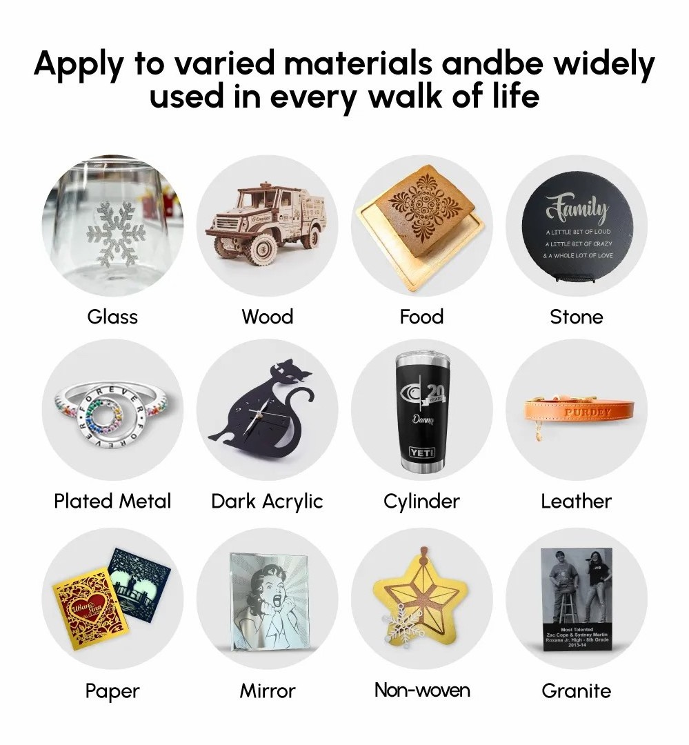 Available Materials of Engraving :Wood, Paperboard, Black Acrylic, Leather, Some Plastic(opaque), Power Coated Metal, etc.