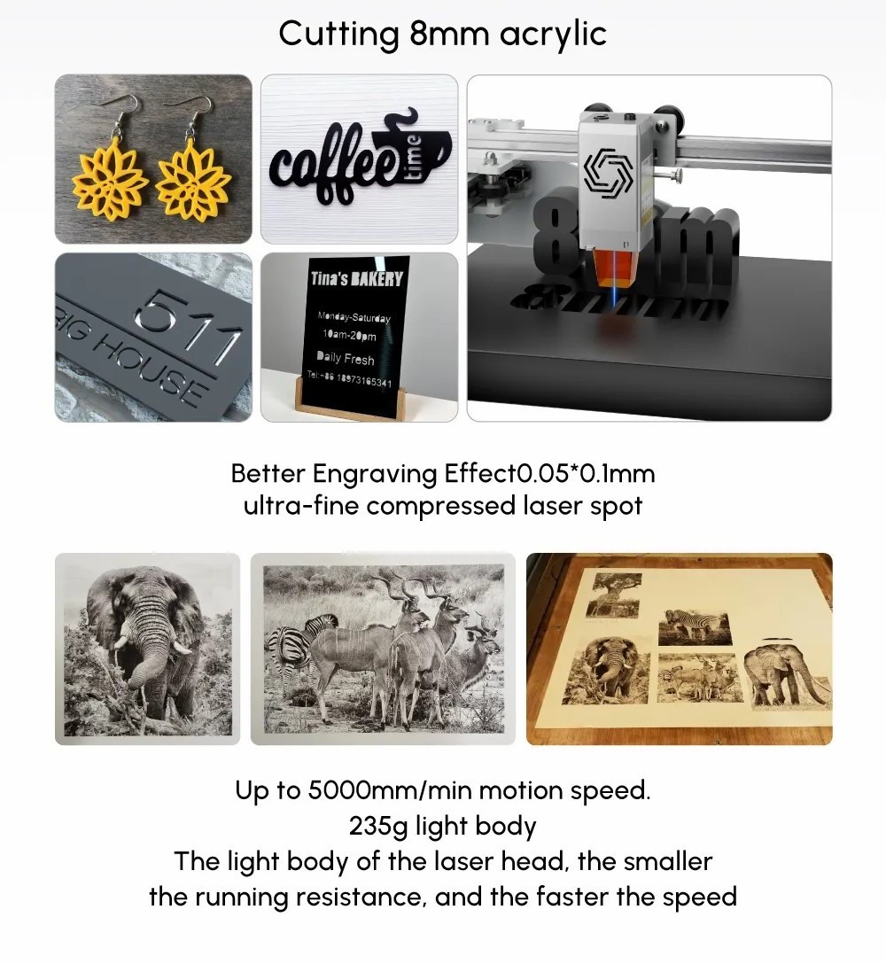 Engraving and cutting of various materials can be realized.
