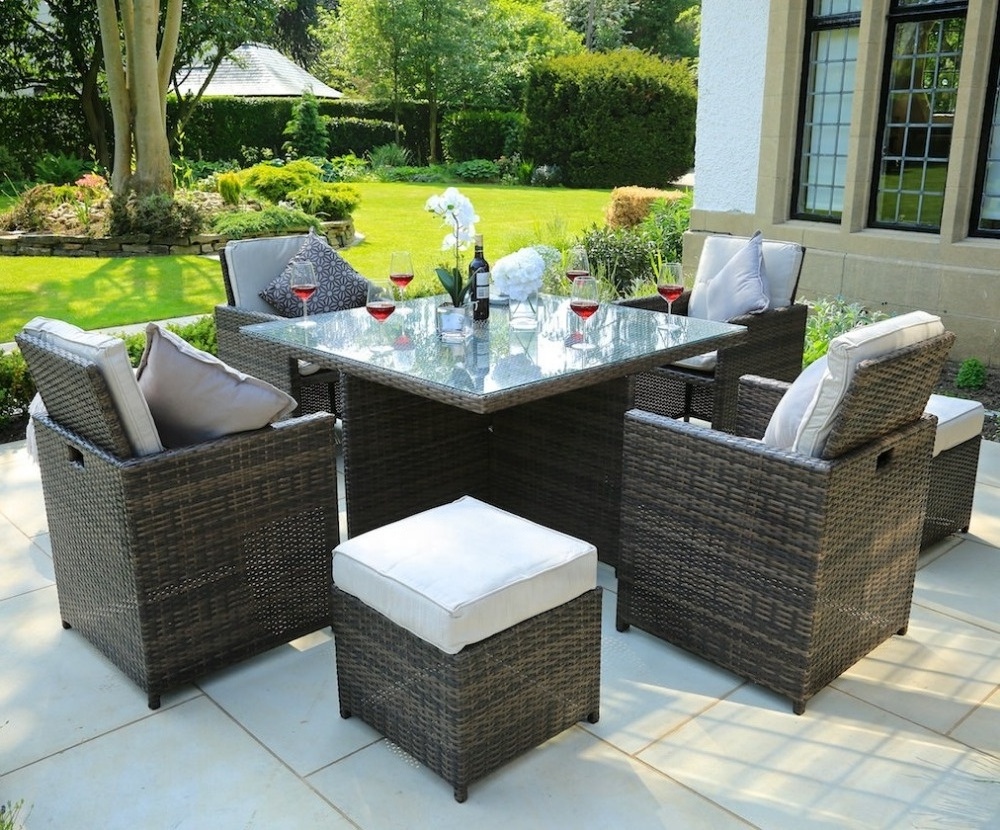 This is a very popular type of furniture in an outdoor courtyard, which is suitable for any modern, fashionable or traditional garden, patio, and deck. Chairs and footpads can be easily shrunk into the table, which is a great space solution. The full set of preferential prices includes cushions.