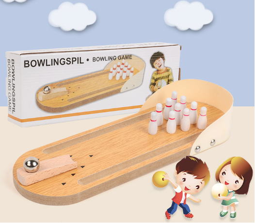* MINI DESKTOP GAMING TOY Bowling game is easy to set up and fun to play. Just stand up the ten mini bowling pins, position the ramp in the desired direction, and then send the ball rolling down.