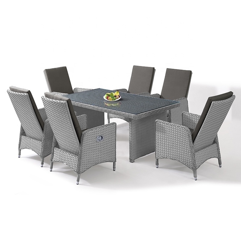 Adjustable Outdoor Rattan Dining Chair Hotel Restaurant Glass Long Table 6 Chairs Patio Outside Garden Grey Wicker Dining Set