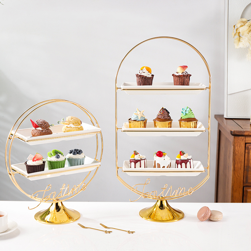 Home Decoration Style Luxury Gold ceramic and Metal 3 Tiers Cake Desert Fruit Plate Serving Trays