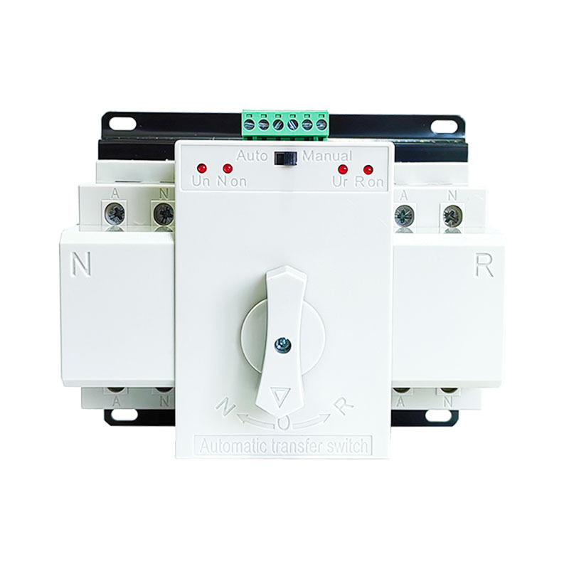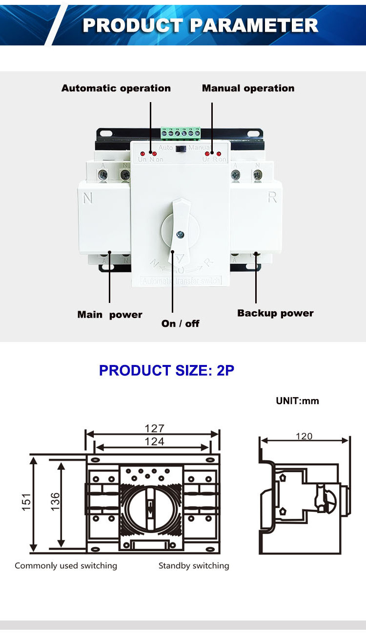 BEYQ2C-125 Dual Power Automatic Transfer Switch (ATS) applies to the terminal double-loop power supply system that 50Hz/60Hz, rated operating voltage 220V 230V(2p) ated current 10 ~ 125 A. It can automatically switch the normal power to reserved power to prove the reliability of power supply, mainly used for fire pumps, smoke fans, elevators, pumps, lighting in high-rise buildings, shopping malls and other places. When the main power supply is normal,using the automatic model,the circuit breaker of reserve power supply is off,the circuit breaker of main power supply is on.When one phase or all three phase of the main power supply is off,the ATS will convert to the reserve power supply(the reserve power is normal),when the main power is normal,the reserve power will recover back to main power again.