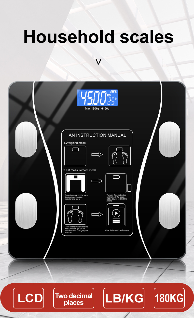 Weight Measuring, Fat Measuring, Water Content Measuring, Body Fat and Water Content Testing, Audio Broadcasting, Calorie Measuring, wifi