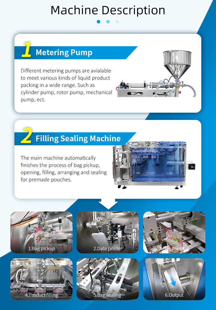 5.Machine can equipment with different metering system like weigher,liquid pump,auger filler,bucket chain for different kinds of product filling and packing in premade bag.