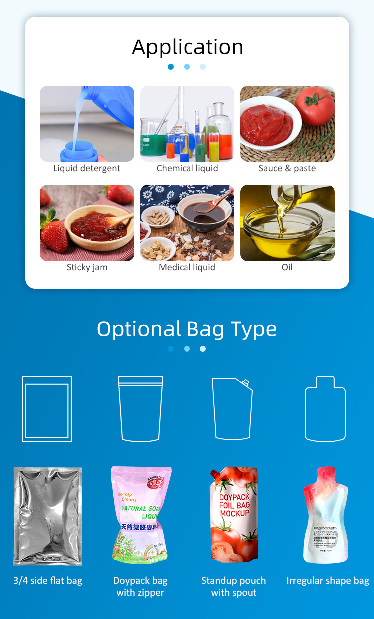 This automatic doypack packing machine is customized for differernt kinds of liquid products like laundry detergent, softener,gel, sauce, paste, jam, oil, juice, drinks, ect. metering, filling, sealing and packing into premade bags. (3 or 4 side seal bag,doypack bag, spout bag, irregular shape premade pouches, ect.)