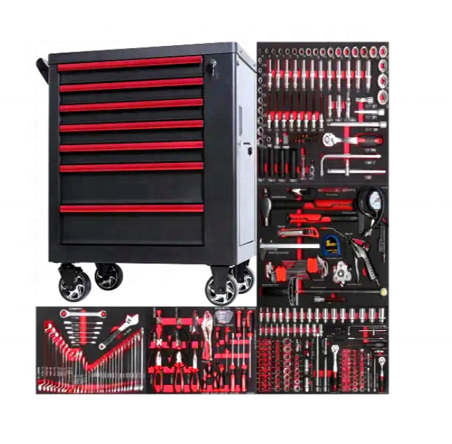 lockable seven-drawer red tool cabinet with five hand tool sets