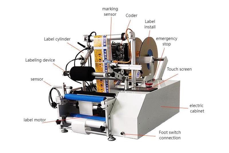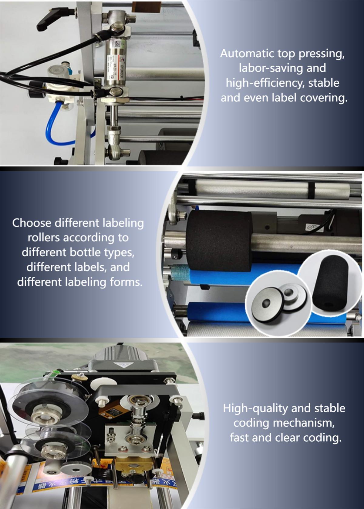 It is suitable for labeling the circumference and semicircle of cylindrical objects that are not stable. It adopts the method of horizontal transmission and horizontal labeling to increase stability and improve labeling efficiency. It can be equipped with a coding machine or an inkjet printer to the labeling head, which can print the production date, batch number and printing barcode and other information on the label. An optional inkjet printer to the conveyor belt can be used to print production date, batch number, barcode and other information on the product before or after labeling.