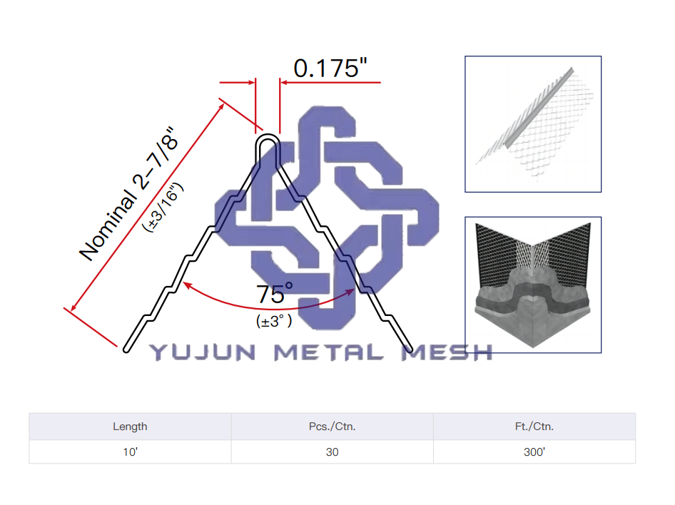 Expanded corner bead consists of 2 expanded metal wings with a width of 2-5/8" and a solid metal nose. The wide wings are flexible and can be easily flexed over irregular, uneven surfaces, which makes it an ideal choice for irregular corners. Plaster keys near