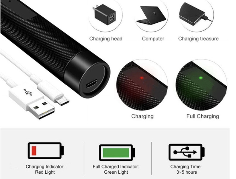 2. External focusing, easy to adjust the thickness of the beam and the size of the spot; 3. USB charging, large capacity, long battery life; 4. Front switch, press to power on, release to power off, easy to use; 5. Imported LD and accessories, increase the service life, more than 5000 hours; 6. Built-in laser module to improve heat dissipation, circuit board collection and protection design (an excellent improvement for current domestic laser circuit board defects); |
