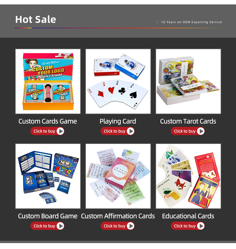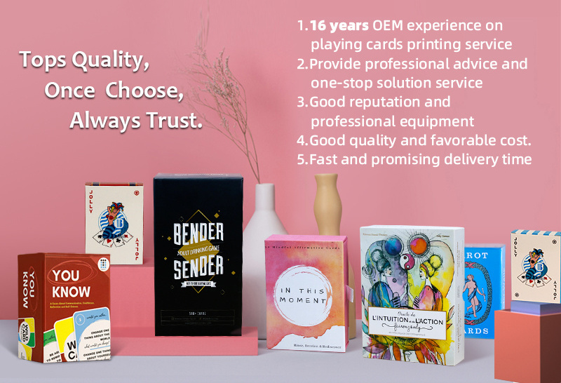 Standard packaging: 1 deck/tuck box with shrink wrap packaging,100-200decks/ctn.