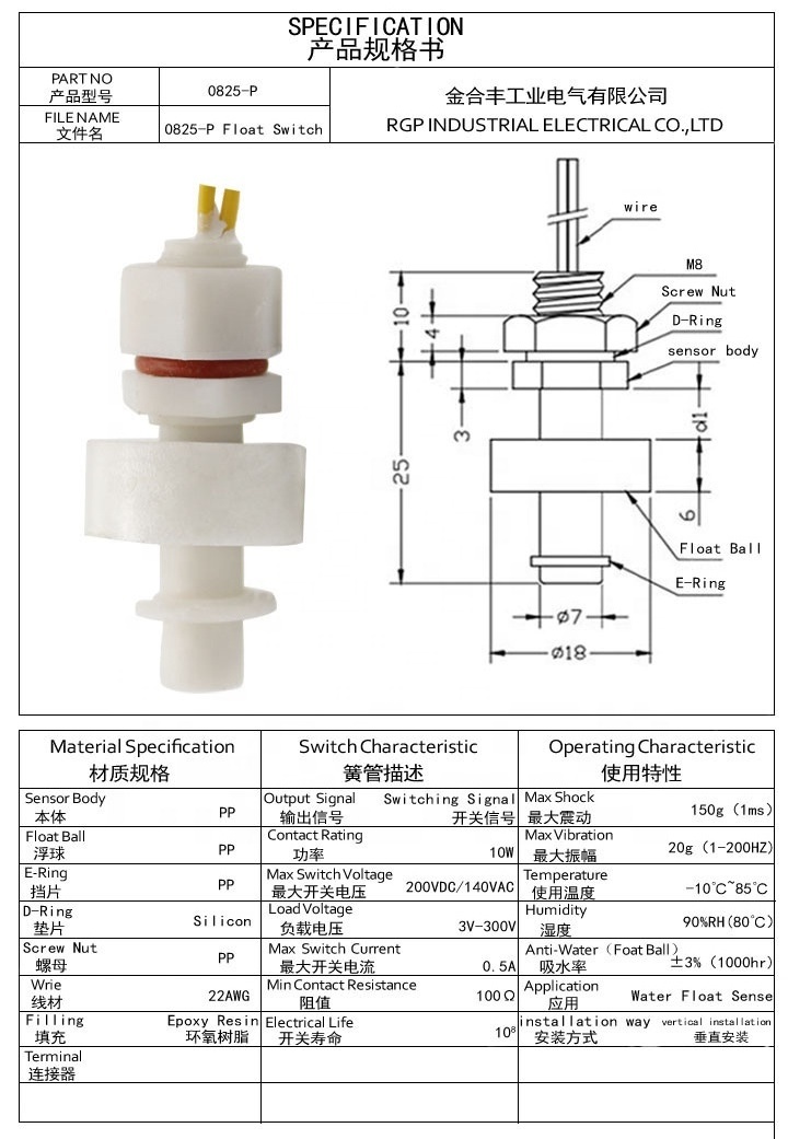 The float level switch utilized the pressure of the liquid buoyancy, along with the liquid level changed, the float ball moved up and down, and this change will trigger the reed switch to OPEN OR CLOSED. It has a simple structure, easily install and used, without a complex circuit, will not be disturbed, whatever the nature of the liquid, pressure and temperature can be used as long as the material selection is corrected. There is a reed switch sealed in the switch them, and there is on permanent magnetic in the float ball.