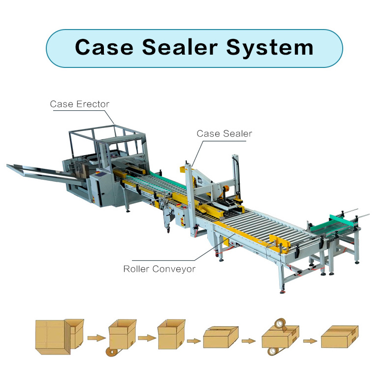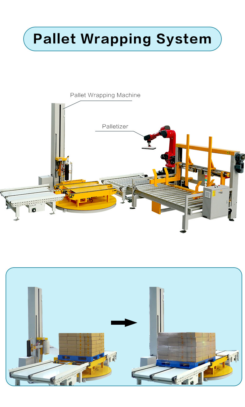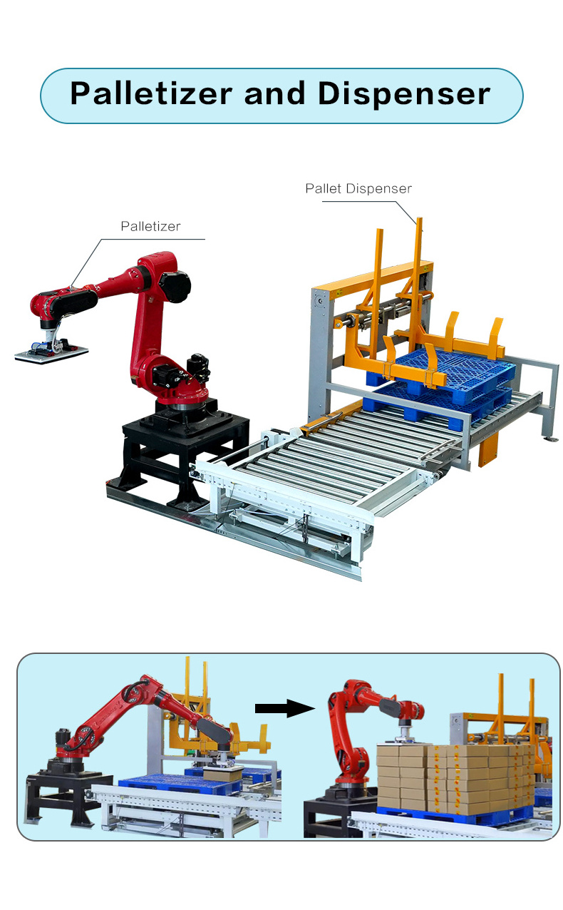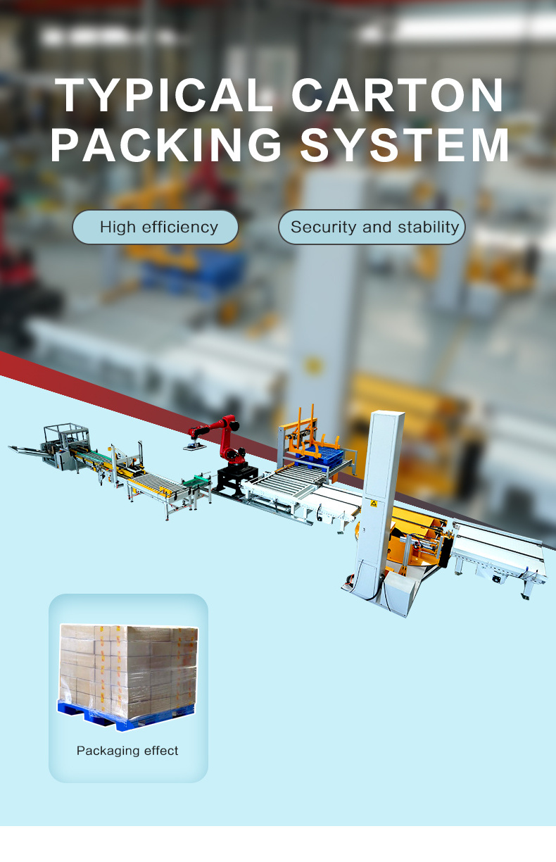 The automatic carton palletizingsystem includes six major parts, carton erecting and sealing system, pallet dispensing system, robot palletizing system, automatic wrapping system and automatic conveying system, etc. The above equipments can be combined arbitrarily, and can also be matched with case packer.