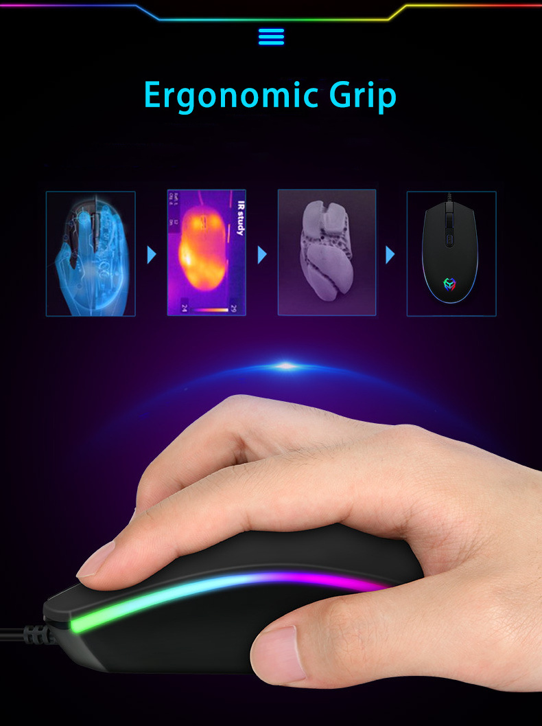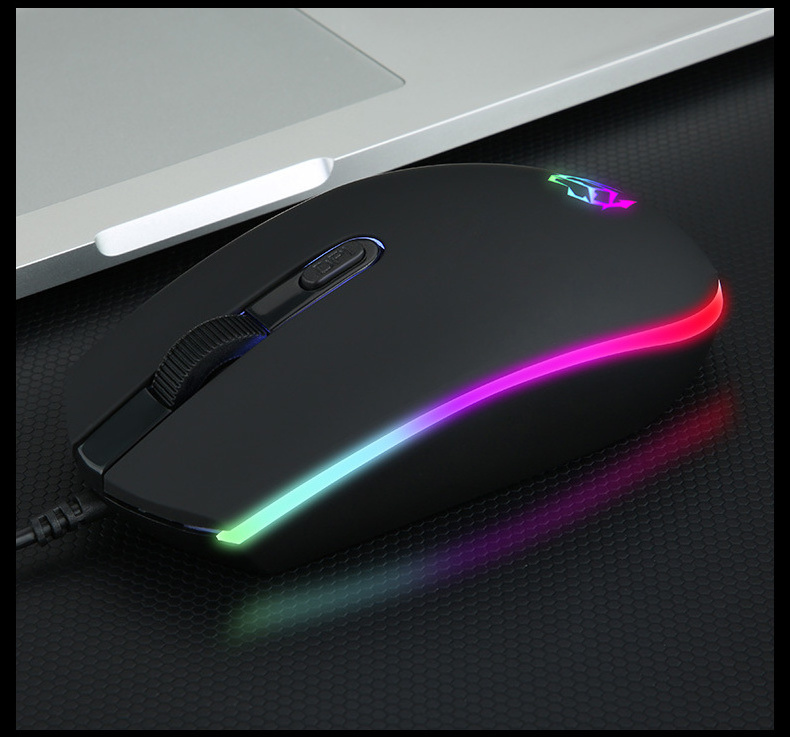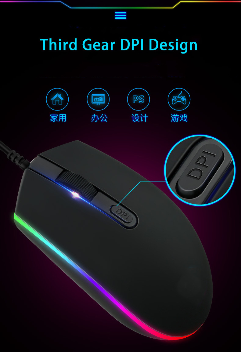 1. 4-key, 3-stage variable frequency DPI regulation 2. RGB running lamp dazzling design, aestheticism 3. Internal fixation weighting block, comfortable movement 4. Teflon's smooth footrest makes the movement more smooth