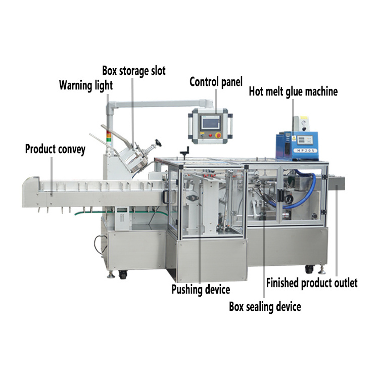 The cartoning machine uses a prefabricated carton to put sheets, blocks, bottles, bags, tubes, and other materials (or pre-packaged parts) and instructions into the carton, and seal the carton in the form of glue or insertion.
