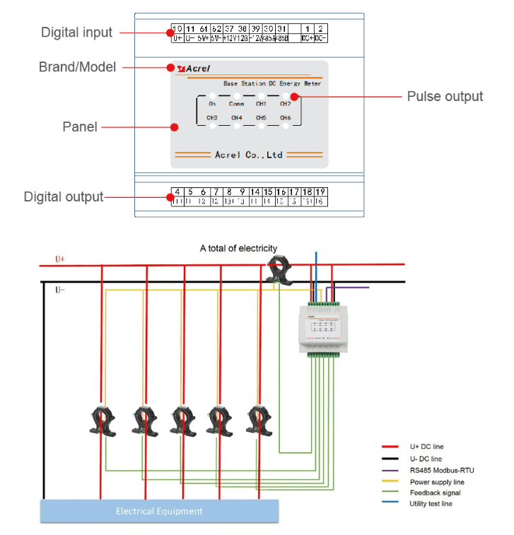 Base station dedicated DC energy meter AMC16-DETT is specially designed for base stations where have sharing requirements, and switch power supply is without the function of sub-user metering. The meter could measure6 circuits DC energy, and supply working current to the matched hall sensors. Meanwhile, it can realize zero drift calibration by upper computer software.have the functions of telemetering,teleindication,teleadjusting, metering at real time,energy quality abnormal alarm, data storage and processing, data interaction.