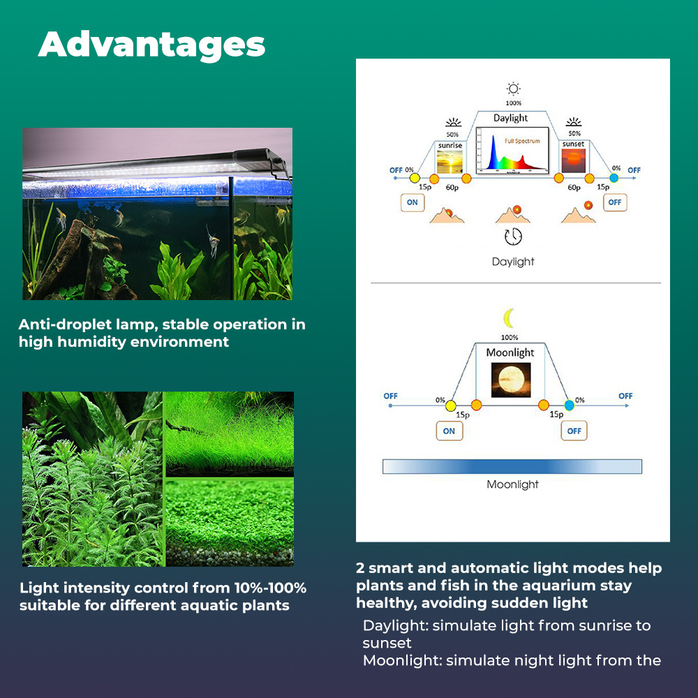 realistic fish and plant colors. - 2 light modes: Daylight and Moonlight. Can Dimming 10 levels from 10% ÷ 100%. - LCD screen