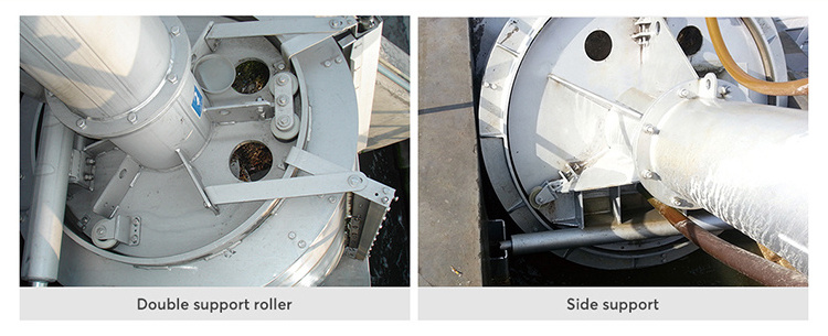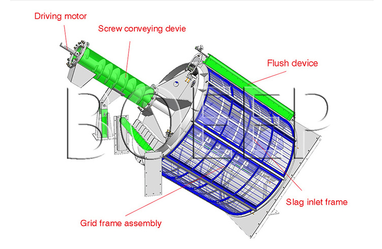 The Rotary Drum Fine Screen has four functions such as intercepting dregs, getting rid of dregs, spiral lifting and pressing dewatering. It is mounted in the channel with the angles of 35 degrees, and the wastewater flows into the drum from the port of the drum, and the grid can intercept the dregs. Then the drum rotates at a fixed speed, and the nylon brush and flush water spray nozzle above the drum can get rid of dregs and export them through spiral lifting. The dewatered and pressed dregs will be delivered to the container or the transportation equipment. The whole process is clear and no smell.