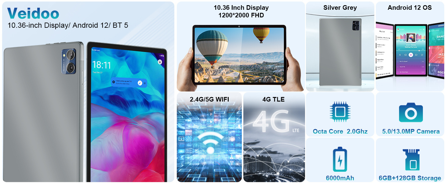 Veidoo Android 12 tablet turns up the responsiveness of vaious user operations to the max.Loading with the latest Android 12 OS features a more fluid and intuitive user experience.6GB RAM, enough space for your entire memory. Enjoy movies, TV episodes, games, apps, e-books and songs.