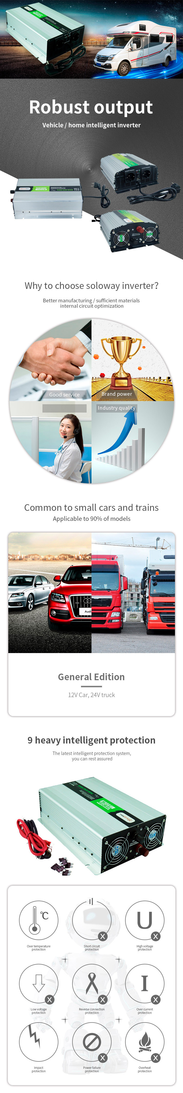 We are mainly engaged in high-tech DC TO AC inverter, solar panel/DC TO DC converter, MPPT/PWM and other solar system accessories, OEM and ODM service are available.
