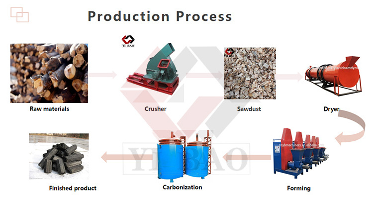 The wood sawdust whole charcoal making machine line is raw materials-- crusher -- dryer -- charcoal briquette making machine -- carbonization furnace.