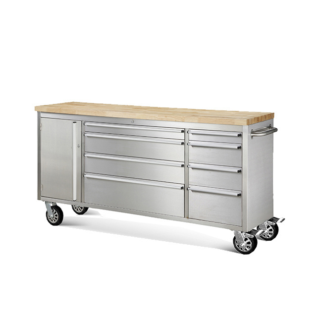 All 430 anti-fingerprint stainless steel 8 drawers 1 cabinet 38mm Thickness Rubber wood top 100lbs Drawer slide 2 side handles 4x6” caster, 2 with brake, 2 without brake alu. drawer handles Drawer liner included flat key included |
