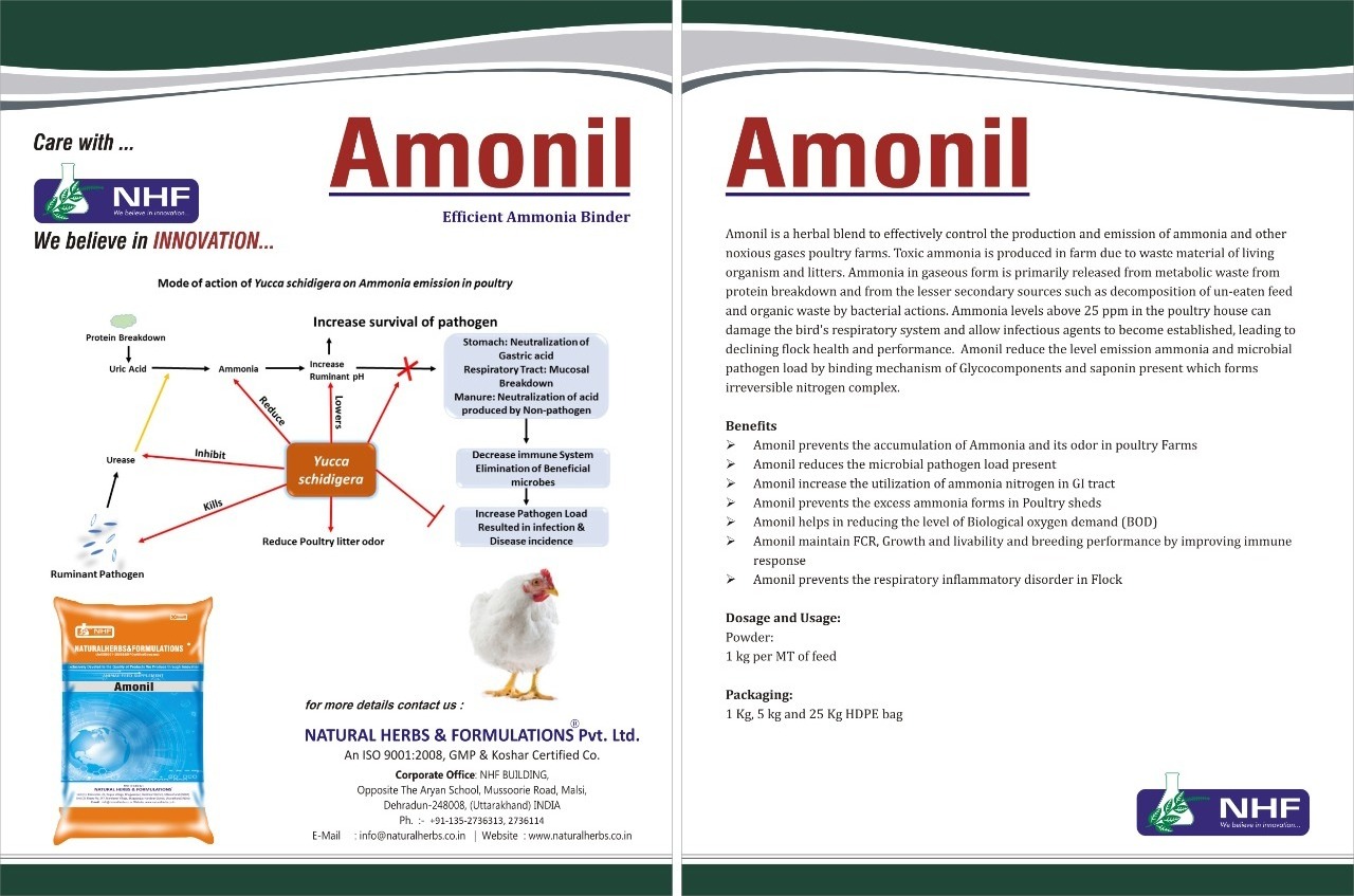 and allow infectious agents to become established, leading to declining flock health and performance. Amonil reduce the level emission ammonia and microbial pathogen load by binding mechanism of Glycocomponents and saponin present which forms irreversible nitrogen complex.