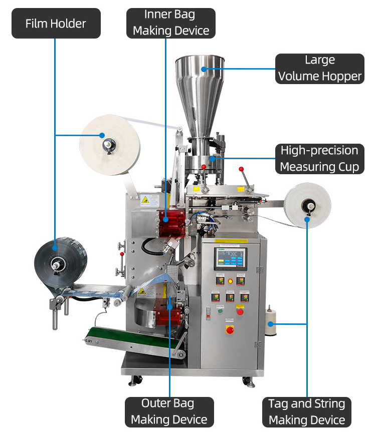 One machine for multiple purposes. Various packaging types are available upon request. Including tea sachet, single chamber tea bag with tag, double chamber tea bag with outer envelope.
