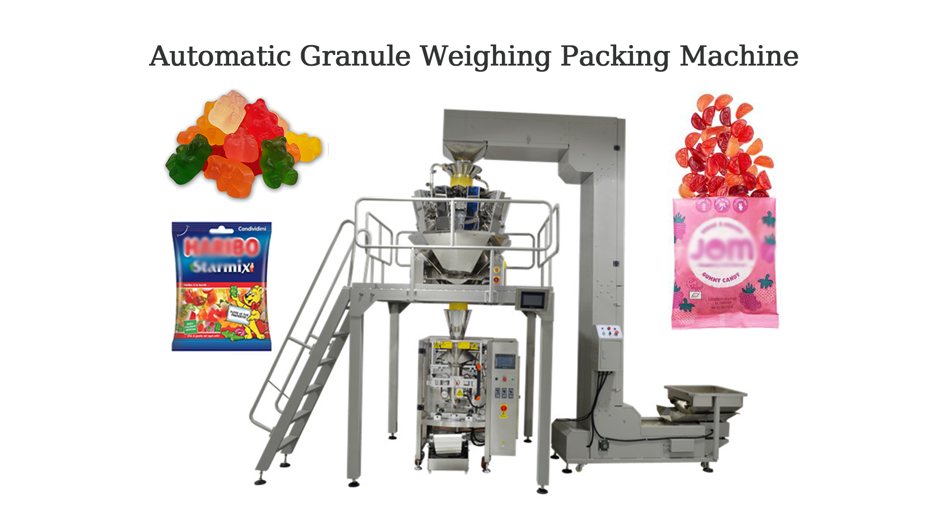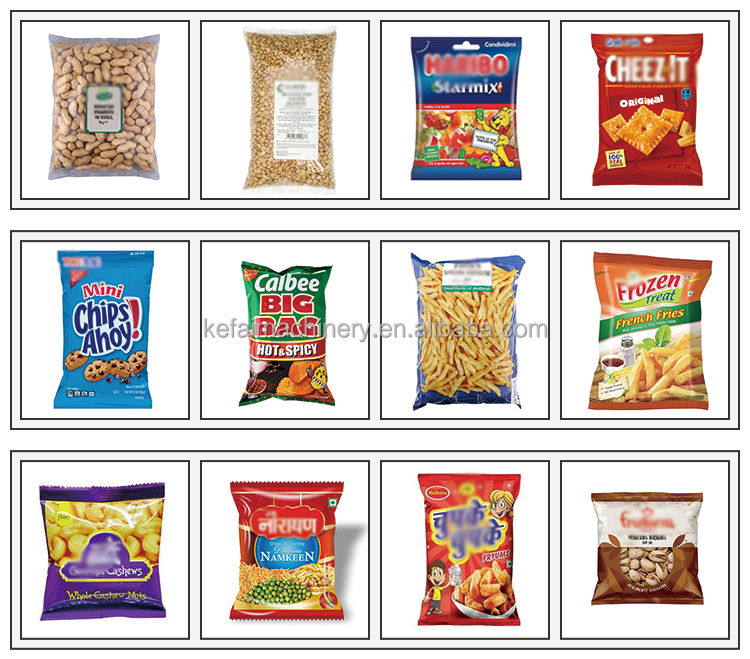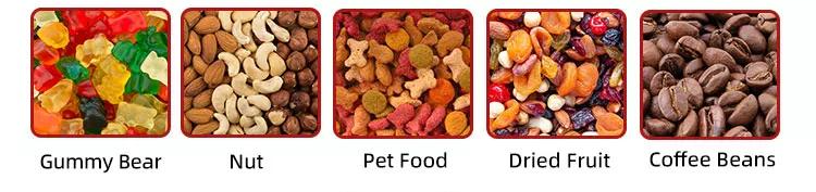 The machine is suitable for packaging granular materials, such as coffee beans, potato chips, nuts, peanuts, cashews, walnuts, pet food, candy, gummy bears, beef cubes, popcorn, meatballs, dried fish, dried fruits, tea, melon seeds, rice, etc.