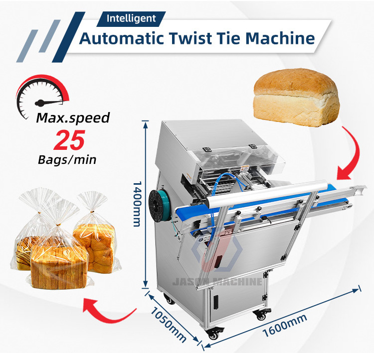 This machine is suitable for automatic twist tie of bagged materials such as bread, chicken, candy, biscuits, fruit, gift boxes, etc.