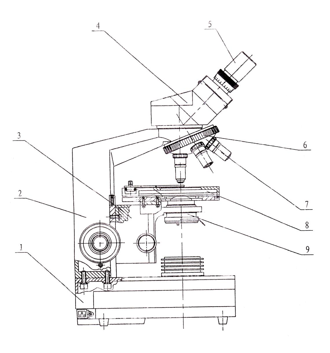 1-Stand 2-Arm 3-Rise And Fall Support 4-Eyepiece Head 5-Eyepiece 6- Nosepiece